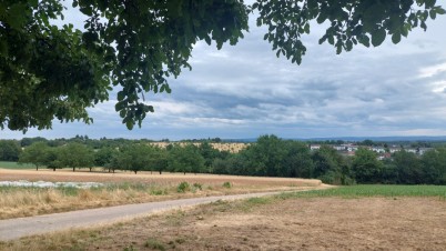 Blick vom Augenblick „Karlsruhe — Rittnert“ auf dem Grünberg in Richtung Thomashof (Pappelallee) und Hohenwettersbach |