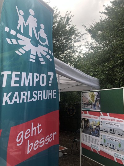 Nach den ersten beiden Aktionen in der Karlsruher Innenstadt am Karlstor und in Grötzingen hatten wir Ende Juli die Gelegenheit uns in einer dritten Aktion öffentlich zu engagieren: Zwei Tage, am Samstag und Sonntag 26./27. Juli konnten wir in der Günther-Klotz-Anlage Tempo7 den Besucherinnen und Besuchern von „DAS FEST“ vorstellen. Über das Glücksrad sind wir mit vielen Menschen, die sich in ihrem Alltag mal mehr, mal weniger Gedanken zur Aktiven Mobilität machen, sehr leicht ins Gespräch gekommen — von jung bis alt. Bis zum nächsten Einsatz des Glücksrads, das wir in Quizrad umbenennen wollen, werden wir die Fragen überarbeiten — es gibt viel zu wenig Fragen zum Fußverkehr.