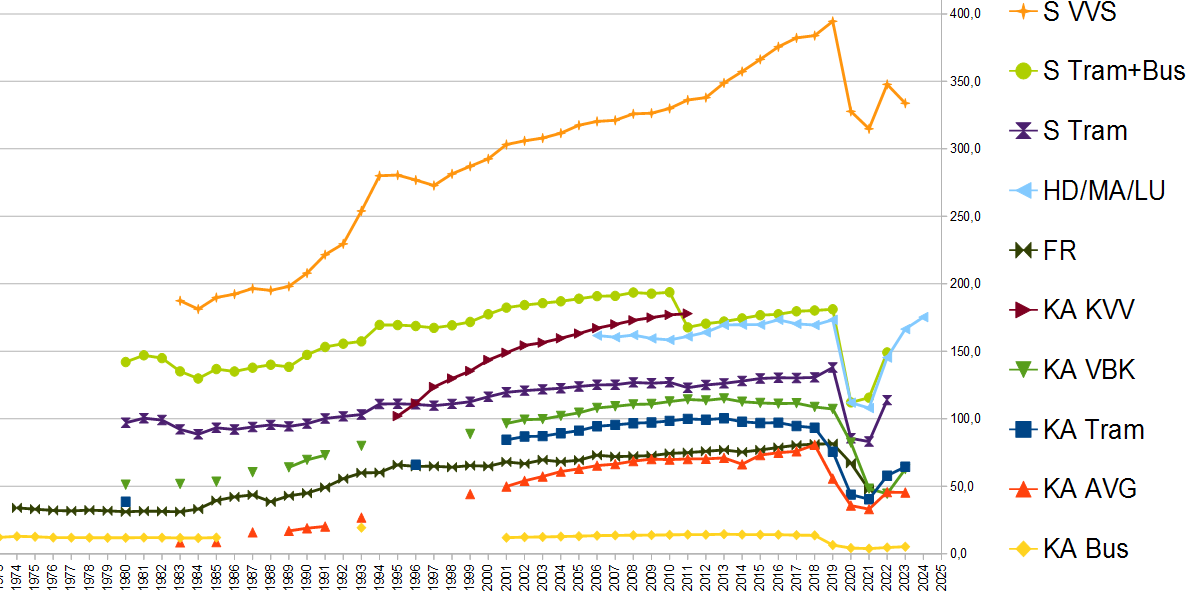 1] Beigelegt haben wir die folgende Grafik der Fahrgastentwicklung seit 1974. Vergleiche sind schwierig, da sich die Methoden ab und zu ändern (siehe Sprung bei den Stuttgarter Zahlen Tram+Bus, in Karlsruhe fand der Methodenwechsel kurz vor Corona statt) und nicht überall durchgehende Datenreihen im Netz auffindbar waren, aber man sieht die gegenüber anderen Datenreihen abweichende Tendenz im Karlsruher Stadtgebiet ab ca. 2011 deutlich, dem Jahr des Baubeginns der U-Strab. Die AVG folgt diesem Trend deutlich weniger stark!